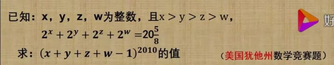 一条方程有四个未知数,显然是解不出来的;而且,未知数都是指数,各项是+在一起而不是×在一起,x+y+z+w也不能求出来。这说明该题不是方程或多项式的问题。根据已知条件,不难发现:这是二进制的数学题。只要把拆分为二进制数的十进制指数形式,就可以通过对应得到x、y、z、w的值。