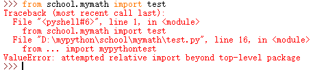 当执行导入school.mymath.test模块时,这个模块又导入了schooltest模块,执行schooltest模块的“from mymath import zhengshiyunsuan”出错。尝试直接导入看看: