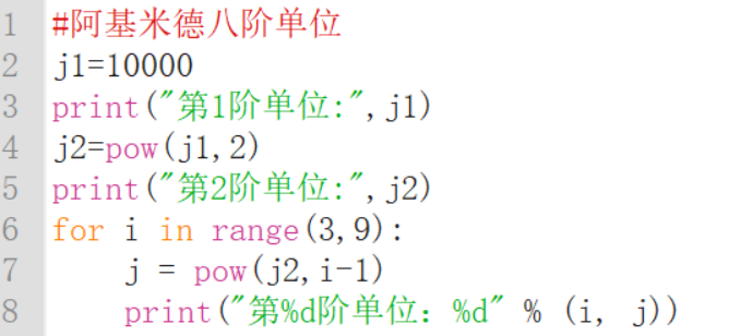 例1 阿基米德从古希腊的最大数字单位“万”开始,引进新数“万万(亿)”作为第二阶单位,然后是“亿亿”(第三阶单位),“亿亿亿”(第四阶单位),等等,每阶单位都是它前一阶单位的1亿倍。编程计算阿基米第八阶单位1后面有多少个0?