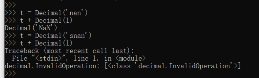 Python 中比较运算符的行为在涉及 NaN 时可能会令人有点惊讶。相等性检测在操作数中有静默型或信号型 NaN 时总是会返回 False (即使是执行 Decimal('NaN')==Decimal('NaN')),而不等性检测总是会返回 True。