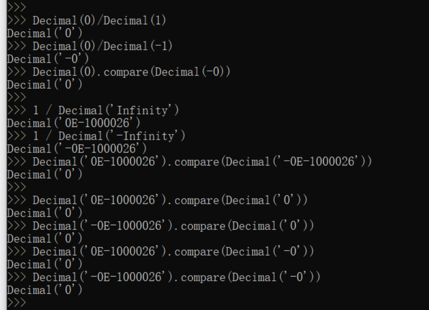 decimal模块的数字系统提供了一些特殊的值,包括NaN,sNaN,-Infinity,Infinity, 以及两种零值 +0 和 -0。 Infinity(无穷大)可以使用 Decimal('Infinity') 来直接构造。