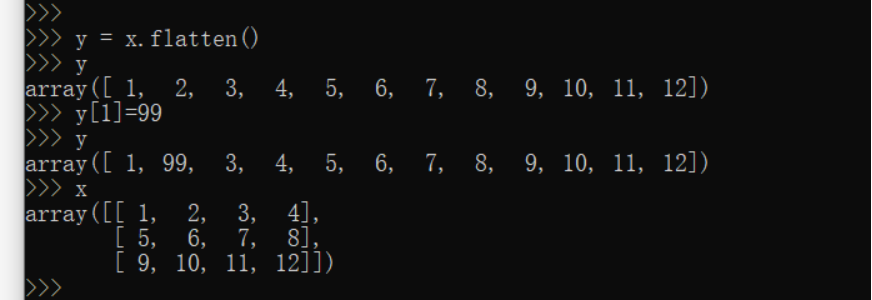 可以用flatten()方法展平成一维数组,改变新数组的值,原数组不变: