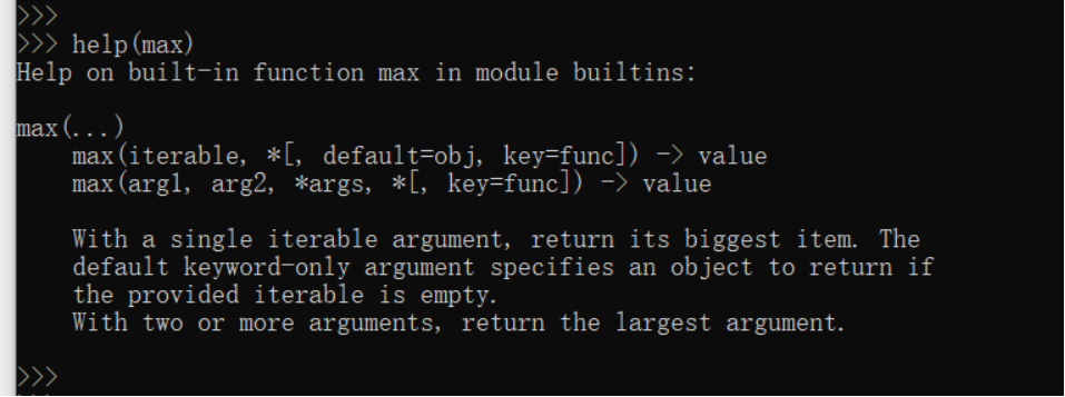 有关builtins模块内置函数max的帮助:使用单个可迭代对象参数,返回其最大项。这个default仅关键字参数指定在输入的可迭代对象参数为空时返回值。对于两个或多个参数,返回最大的参数。 由于访问附加信息非常有用,IPython(安装和使用见附录)使用“?”字符作为访问此文档以及其他相关信息的速记。IPython是一个用于多种语言交互计算的命令shell。有关IPython的更多信息,打开:https://ipython.org/。 例如:
