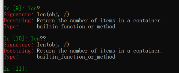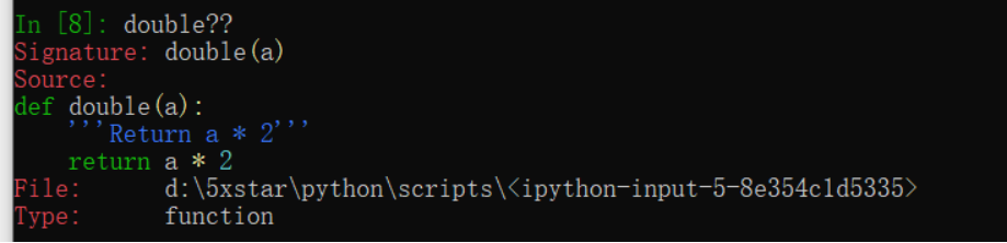 如果所讨论的对象是用Python以外的语言编译的,使用??得到的信息与?相同。在许多内置对象和类型中找到这种情况,例如: