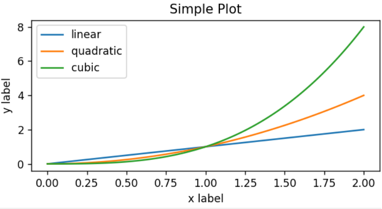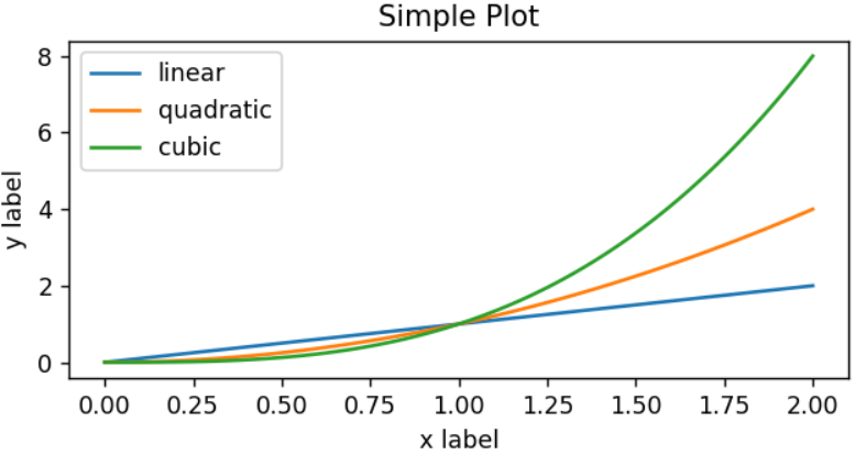 import matplotlib.pyplot as pltimport numpy as npnp.random.seed(19680801) # seed the random number generator.x = np.linspace(0, 2, 100) # Sample data.plt.figure(figsize=(5, 2.7), layout='constrained')plt.plot(x, x, label='linear') # Plot some data on the (implicit) axes.plt.plot(x, x**2, label='quadratic') # etc.plt.plot(x, x**3, label='cubic')plt.xlabel('x label')plt.ylabel('y label')plt.title("Simple Plot")plt.legend()plt.show()