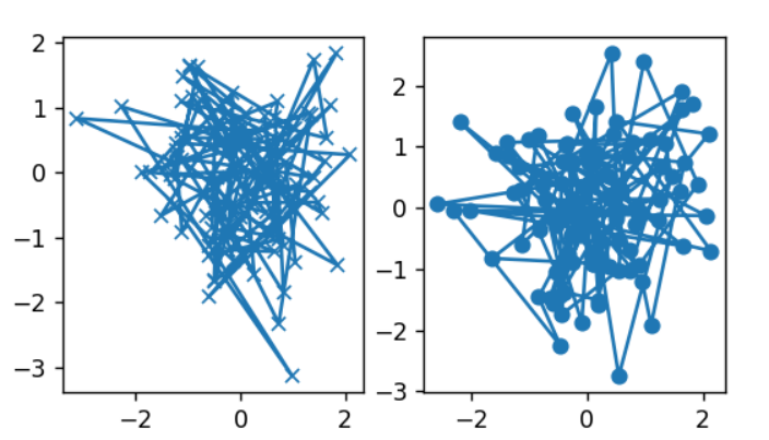 data1, data2, data3, data4 = np.random.randn(4, 100) # make 4 random data setsfig, (ax1, ax2) = plt.subplots(1, 2, figsize=(5, 2.7))my_plotter(ax1, data1, data2, {'marker': 'x'})my_plotter(ax2, data3, data4, {'marker': 'o'});fig.show()