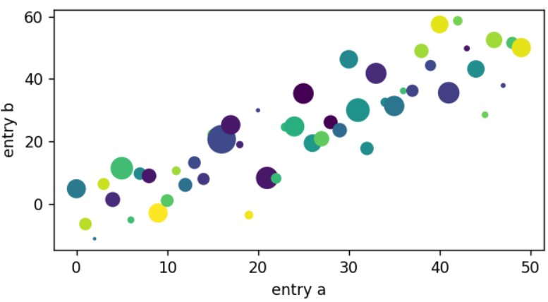 import matplotlib.pyplot as pltimport numpy as npnp.random.seed(19680801) # seed the random number generator.data = {'a': np.arange(50), 'c': np.random.randint(0, 50, 50), 'd': np.random.randn(50)}data['b'] = data['a'] + 10 * np.random.randn(50)data['d'] = np.abs(data['d']) * 100fig, ax = plt.subplots(figsize=(5, 2.7), layout='constrained')ax.scatter('a', 'b', c='c', s='d', data=data)ax.set_xlabel('entry a')ax.set_ylabel('entry b')fig.show()