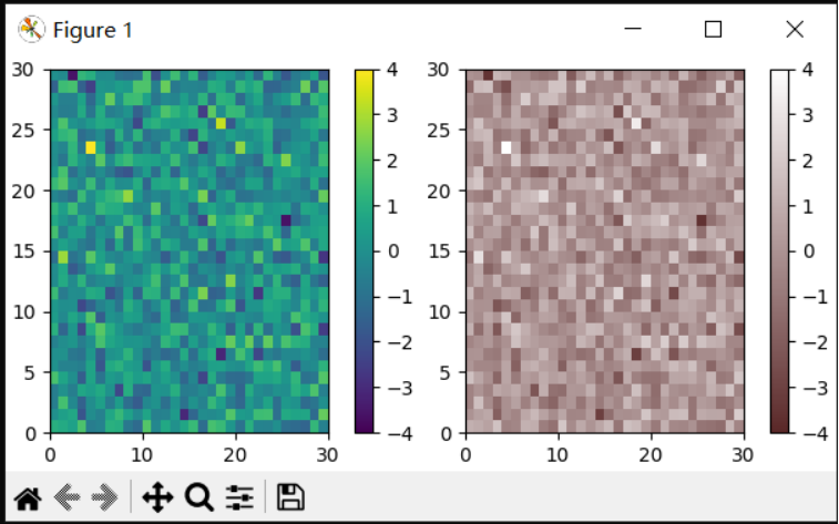 def plot_examples(colormaps): """ Helper function to plot data with associated colormap. """ np.random.seed(19680801) data = np.random.randn(30, 30) n = len(colormaps) fig, axs = plt.subplots(1, n, figsize=(n * 2 + 2, 3), constrained_layout=True, squeeze=False) for [ax, cmap] in zip(axs.flat, colormaps): psm = ax.pcolormesh(data, cmap=cmap, rasterized=True, vmin=-4, vmax=4) fig.colorbar(psm, ax=ax) plt.show()