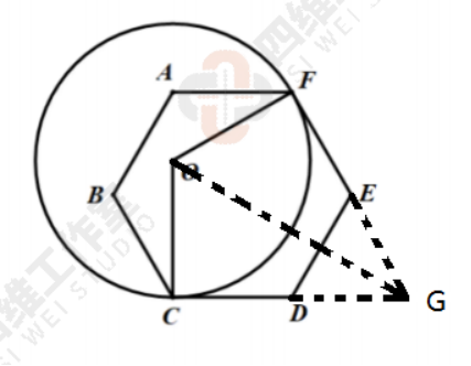思路分析:要求OC,但OC不在任何现存的三角形中,为此延长CD和FE交于G,连接OG,如下图,△DEG是等边三角形,OC可解。