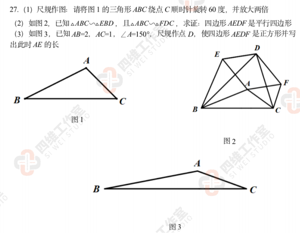 (2)思路分析:线太多,很难直接看出它们的关系,那么我们不妨倒过来想,因为要证明它是平行四边形,那么它一定是平行四边形。因为条件都是相似图形,那么使用平行四边形的角性质——同旁内角和等于180°。先考察∠EDF+∠DEA=180°,不难推出∠BEA=BDC,因为不难推出∠ABE=∠CBD,所以△ABE∽△CBD。反过来,只要证明△ABE∽△CBD,就可以得到∠EDF+∠DEA=180°,由△BDE∽△BCA,问题可以解决;同理也可以证明∠EDF+∠DFA=180°。【(2)证明】∵ △BDE∽△BCA,∴ BE/BA=BD/BC,∠EBD=∠CBA,∴ BE/BD=BA/BC,∠EBD+∠DBA=∠CBA+∠DBA,即 ∠EBA=∠DAC,∴ △EBA∽△DAC (SAS)∴ ∠BEA=∠BDC,∵ △BDE∽△DCF,∴ ∠FDC=∠EBD,∴ ∠EDF+∠DEA=∠EBD+∠BEA+∠EDB+∠DEA=180°。∴ DF//EA.同理可得,ED//AF,∴ 四边形AEDF是平行四边形。(3)思路分析:①邻边相等,②有一个角是90°的平行四边形是正方形。为此,我们要更深刻的理解题意——本题定理(建议以首次命题人的姓名命名该定理放入教科书):以三角形一边的两端点为不变点缩放三角形,缩放比之和大于1,以这边的两端点为中心,同侧以相反的方向旋转缩放后的三角形,当这边两端点的对应点重合时,三个三角形除了这边的两端点外,剩下的4个顶点连线是一个平行四边形。由于AB=2AC,因此右侧缩放比务必是左侧的2倍(右侧是a>⅔,左侧是½a,a+½a>1),即DB=2DC(满足①邻边相等);由(2)证明可知∠BDC=∠BAC-90°=60°(满足②有一个角是90°)。综合条件,只有一个锐角是60°的直角三角形。【(3)解答】①作图:第一步:延长BC,过C作BC的垂线: