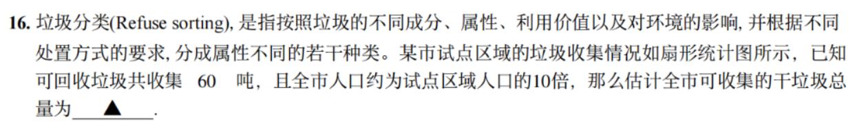 样品干垃圾数量= 300 × 50% = 150(吨)